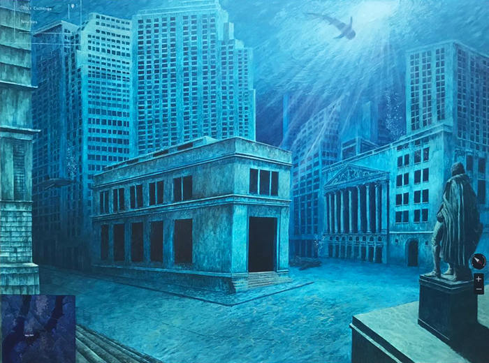 De nuestros pintores contemporáneos y más jóvenes es imprescindible mencionar a Hugo Gallegos, quien también capta una contingente ausencia humana en las ciudades. En 2015 elaboró el óleo Desbordamiento en Bellas Artes. Es una vista del Palacio de Bellas Artes y del de Correos, además de una parte de la Alameda, tomada desde el lado de Av. Juárez, con todo el piso invadido por el agua. Se despliega sin persona alguna, apenas sobresale la escultura de Madero montado a caballo entre las aguas. Esta mirada se extenderá en una serie que ha venido desarrollando recientemente llamada Atlántida, en la que pinta otras ciudades, mexicanas y extranjeras, de las que se estima pueden ser las primeras en quedar inundadas debido al cambio climático. Son imágenes que suponen el cómo se verían las poblaciones sumergidas en el fondo acuático, con base en datos recopilados de la Administración Nacional de la Aeronáutica y del Espacio[4] y de Google Maps.