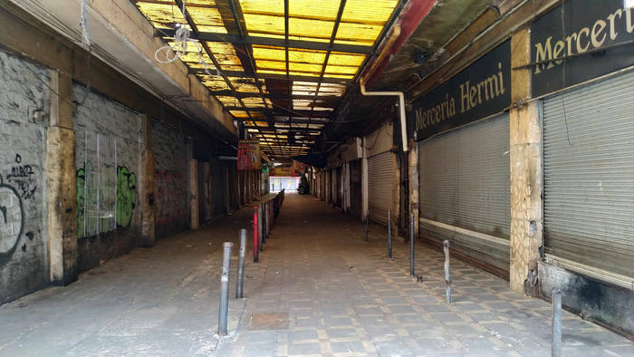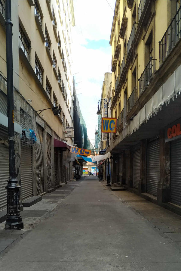 Principalmente en mayo de 2020, al deambular por estos espacios, el fotógrafo Edgar Isaac Jiménez ha aprehendido imágenes discordes en algunos pasajes y callejones populares del Centro Histórico, donde se localizan comercios medianos pero generalmente abarrotados. Antes, en ellos, las formas de los artículos creaban colecciones de racimos uniformes que cubrían las fachadas de los locales, con riqueza de volúmenes, espesuras de tonos alegres y festivos. Eran como disfraz, pues ahora que se ostentan desnudas, sin mercancías exhiben una superficie en decadencia; ductos lúgubres y sin rumbo.