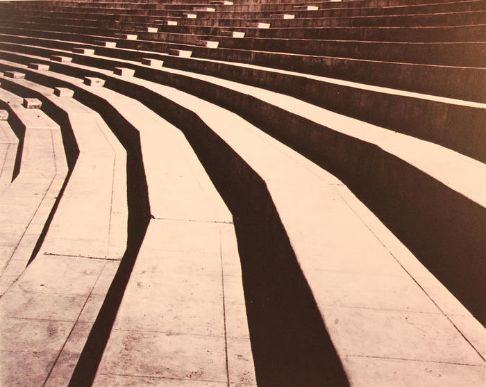 Los artistas visuales también han captado la inmovilidad y el aislamientoen las estructuras urbanas con propósitos estéticos. Tina Modotti en Estadio utiliza la ausencia humana para resaltar las graderías de una instalación deportiva, en busca de la esencia de formas y sombras. Con ese recurso sorprende una geometría atrapada por el imperturbable sol agobiante que, a la vez, la delinea.