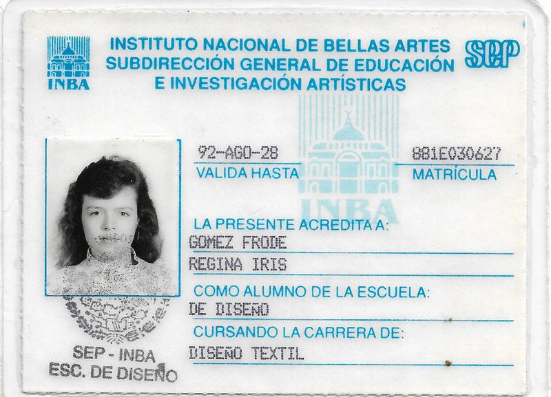 Regina Iris Gómez Frode. Licenciada en Diseño Textil en la Escuela de Diseño del Instituto Nacional de Bellas Artes. (1988-1992). Estudios completos de maestría en Historia del Arte en la FFyL UNAM. Maestra de 1995 a 2002, fue docente en la Escuela de Diseño Gráfico de la Universidad del Pedregal. Desde 1994 a la fecha es docente en la EDINBA, donde ha impartido materias correspondientes a las áreas de Diseño, Procesos Técnicos y Teoría y Análisis.