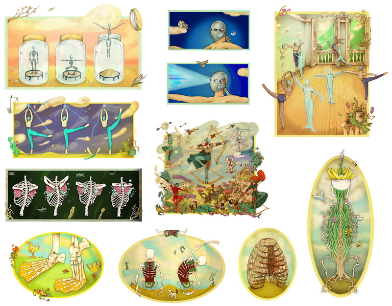 Las imágenes abarcan un universo conformado por conceptos inherentes al cuerpo que danza ─como equilibrio, flujo, dinámica, estática, impulso, dirección, flexibilidad o proyección. Las ilustraciones fueron concebidas como mundos complejos y surrealistas, haciendo de los conceptos basamento de su creación e hilo conductor para tejer analogías y metáforas, debido a la importante función poética e imaginativa que éstos llevan a cabo en el proceso de percepción y comprensión del mundo, de ejecución e interpretación del movimiento y la danza.