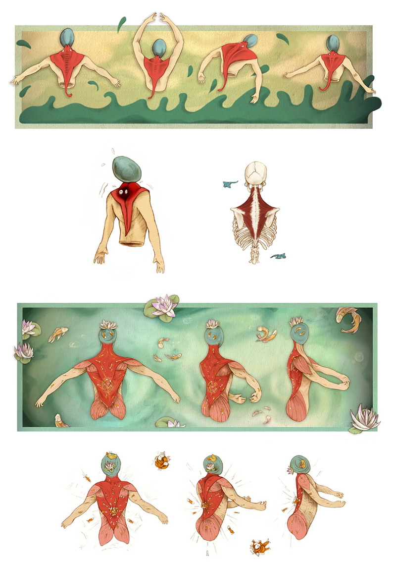 Franceso Orazzini (FO): Cuando Carmen se acercó para develarme su proyecto, yo ya llevaba años interesado en realizar algún tipo de trabajo alrededor del eje temático del “cuerpo”. Si toda persona posee un cuerpo, entonces nada mejor que un cuerpo sabría comunicarse a todas las personas. “Cuerpo”, sí, ¿pero un cuerpo bailando ballet? Eso no lo había ni lejanamente considerado. ¡Imagínense lo que puede significar para un dibujante que, aunque muy curioso y con inclusive esporádicas incursiones en el mundo escénico, es llamado a ilustrar un proyecto anatómico-surreal que tiene sus raíces en las enseñanzas de la técnica del ballet!