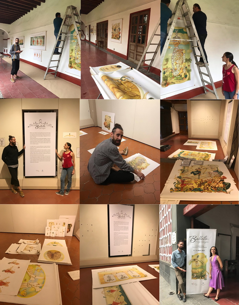 La última presentación ante la sociedad de esta historia de colaboración interdisciplinar, imaginativa-mente artística, educativa y muy conceptual, fue la exposición con la que inicia esta crónica y que se llevó a cabo del 6 al 30 de mayo de 2023 en el IIC de la Ciudad de México, donde se exhibieron las ilustraciones impresas en gran calidad sobre loneta de algodón, varias de ellas en un formato de hasta 200 x 110 centímetros (imágenes 13 y 14).