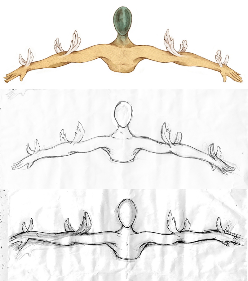 A nivel personal, supe que cada imagen “mía” transmutaría al ser filtrada por el imaginario de Francesco, y por el proceso mismo de ser transferida de un soporte material (cuerpo que danza) a otro (ilustración). Todas y cada una de las imágenes que trabajaría con Francesco atravesarían forzosamente el proceso alquímico de la traducción. Recordando a Paul Ricoeur, traducir una idea, un discurso o una imagen de un lenguaje a otro implica asumir las renuncias y las ganancias que siempre resultan de este proceso. Si aceptamos que la danza y las artes plásticas son lenguajes, ambos artísticos pero diferentes, entonces, tenía que abrirme a la “hospitalidad lingüística, [...] donde el placer de habitar la lengua del otro es compensado por el placer de recibir en la propia casa la palabra del extranjero”. [16] Si me negaba a abrazar la experiencia de lo extranjero, corría el riesgo de quedar encerrada “en la acritud de un monólogo”, [17] seguir sola con “mis” imágenes y perder la oportunidad de sorprenderme ─y crecer─ con las otras posibilidades de imaginar lo hasta entonces, tantas veces, imaginado.