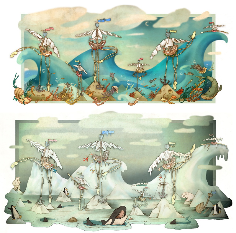 Mantendríamos como personaje principal de toda la obra al personaje “develado” en 5ª posición del primer combo de ilustraciones. En el camino este personaje encontró sus variantes: de género, con caderas y piernas humanas, con otros colores de piel, convertido en barcos, o disfrazado de otros personajes, como el mayordomo o los diversos arqueros. También se introdujo al personaje secundario Esqueleto y al personaje Resorte.