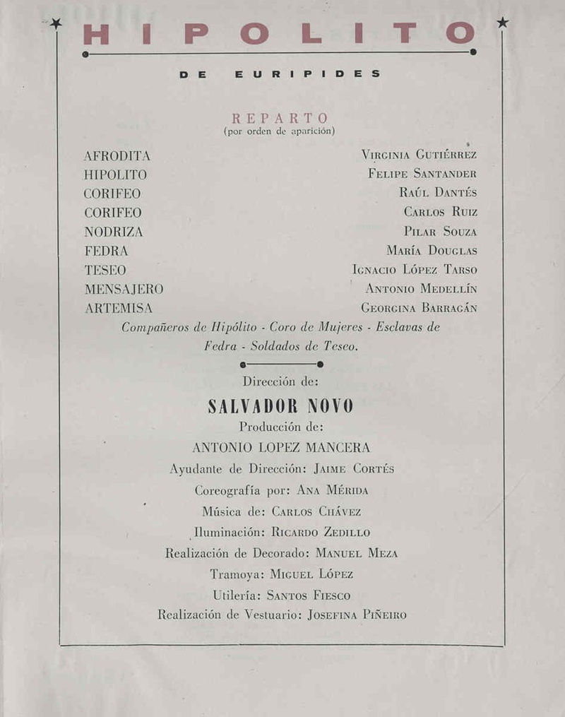 Programa de mano de Hipólito, 1957. Fondo Antonio López