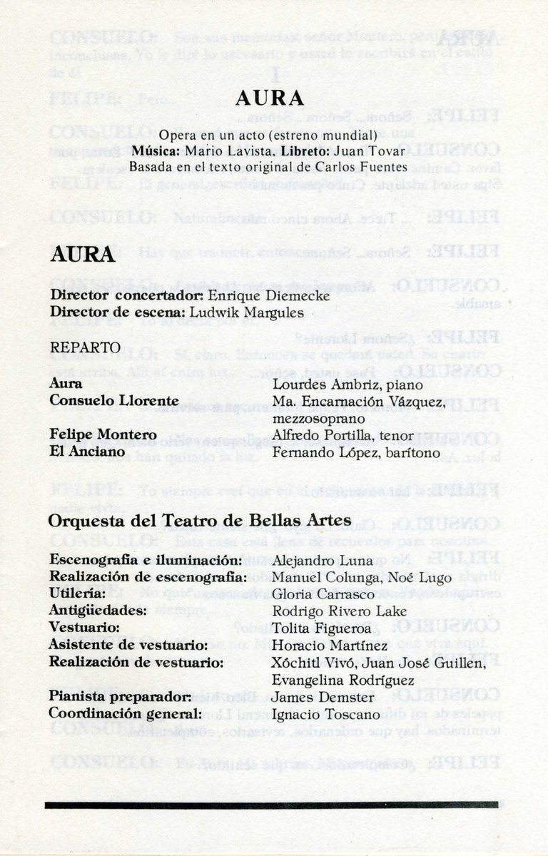 Programa de mano de Aura, 1989. Fondo Ludwik Margules,