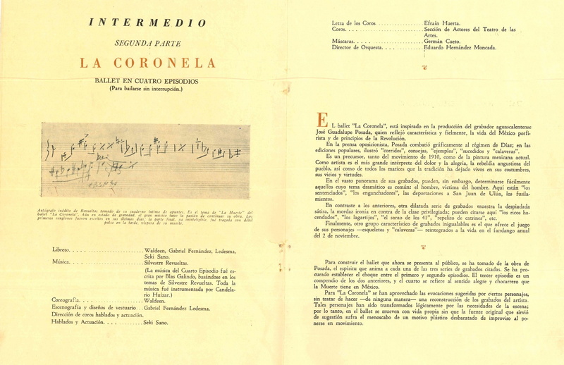 Lo anterior se puede apreciar en el ballet La Coronela, estrenado en 1940 en el Palacio de Bellas Artes en la Ciudad de México. Se trata de un derroche de interdisciplina, ya que se basó en la obra del grabador José Guadalupe Posada, la coreografía estuvo a cargo de Waldeen, que también fue autora del libreto, junto con Seki Sano y Gabriel Fernández Ledesma, mientras que la composición musical fue de Silvestre Revueltas y Blas Galindo. [15] Seki Sano fungió como director de escena y tuvo como asistente a Ignacio Retes; Efraín Huerta escribió la letra de los coros, el diseño de la escenografía y el vestuario fue de Gabriel Fernández Ledesma y el de las máscaras lo realizó Germán Cueto. Sin dejar de mencionar a algunas de las bailarinas que formaban parte del Ballet de Bellas Artes, entre ellas, Waldeen, Josefina Lavalle y Guillermina Bravo, y a actrices que participaron en el montaje, como María Douglas, así como a Eduardo Hernández Moncada como el director de orquesta y a Candelario Huízar en la instrumentación.