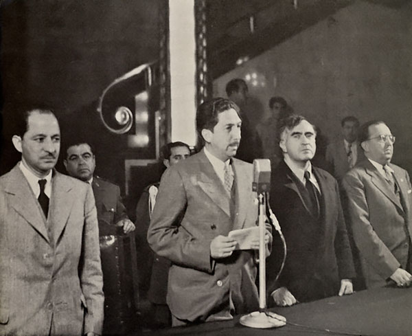 18 de septiembre de 1947, Manuel Gual Vidal, secretario de Educación Pública; Miguel Alemán Valdés, presidente de la República; Carlos Chávez, director del