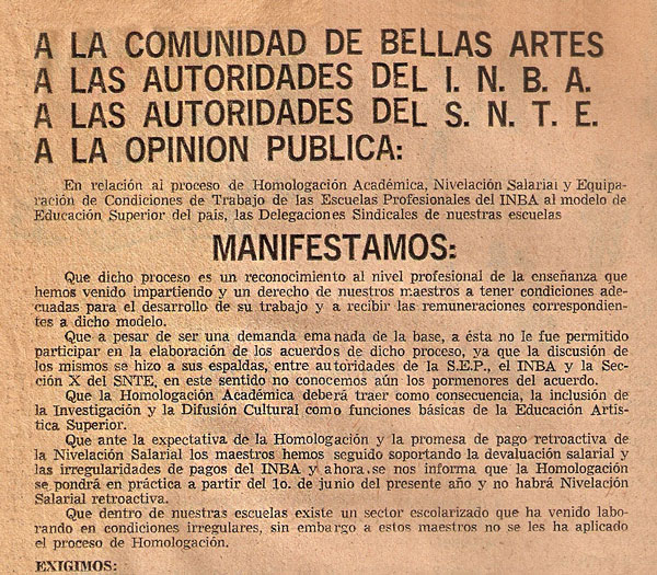 Homologation at INBA’s Professional Schools and the Democratic block of Bellas Artes' teachers
